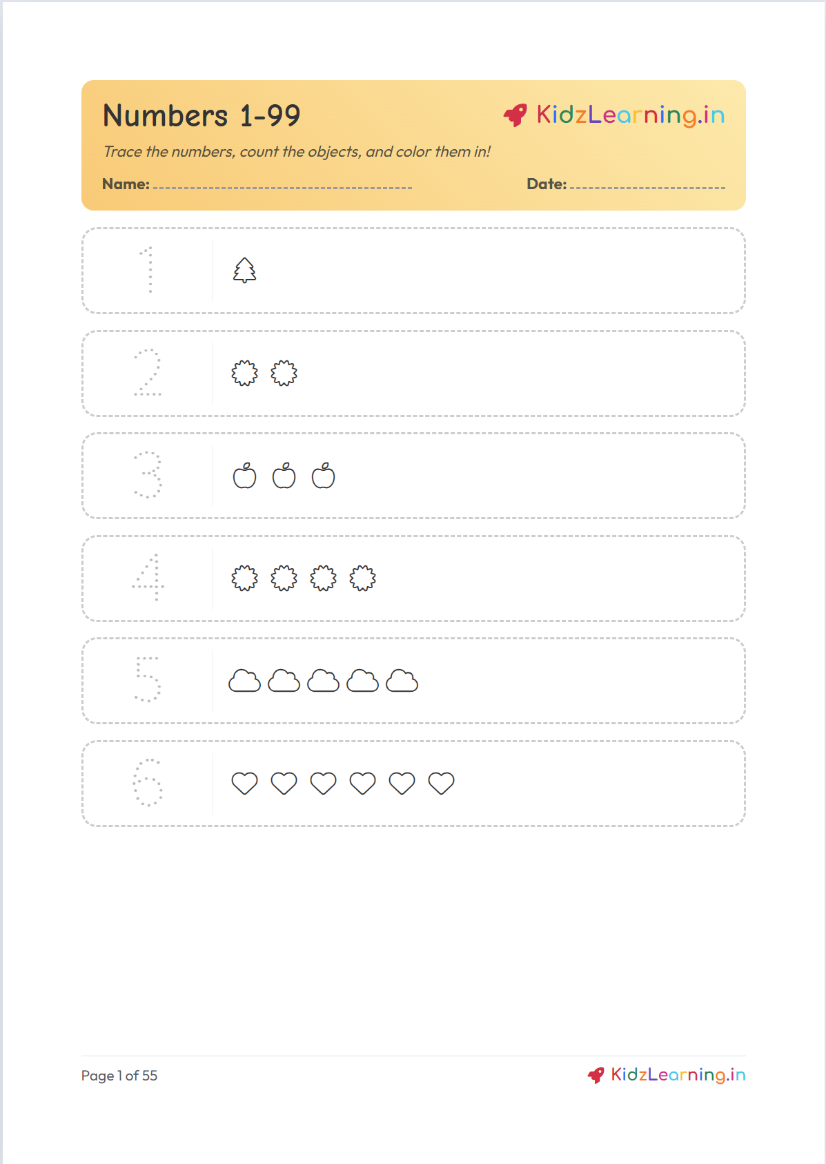 Help young learners build early number confidence with this printable Numbers 1–99 worksheet pack.